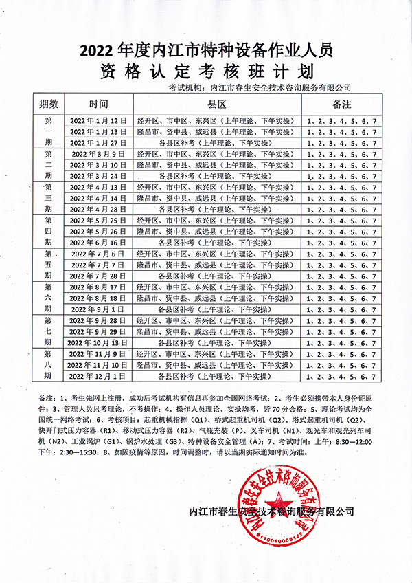 2022年春生公司01期特種設備作業(yè)人員考核時間安排